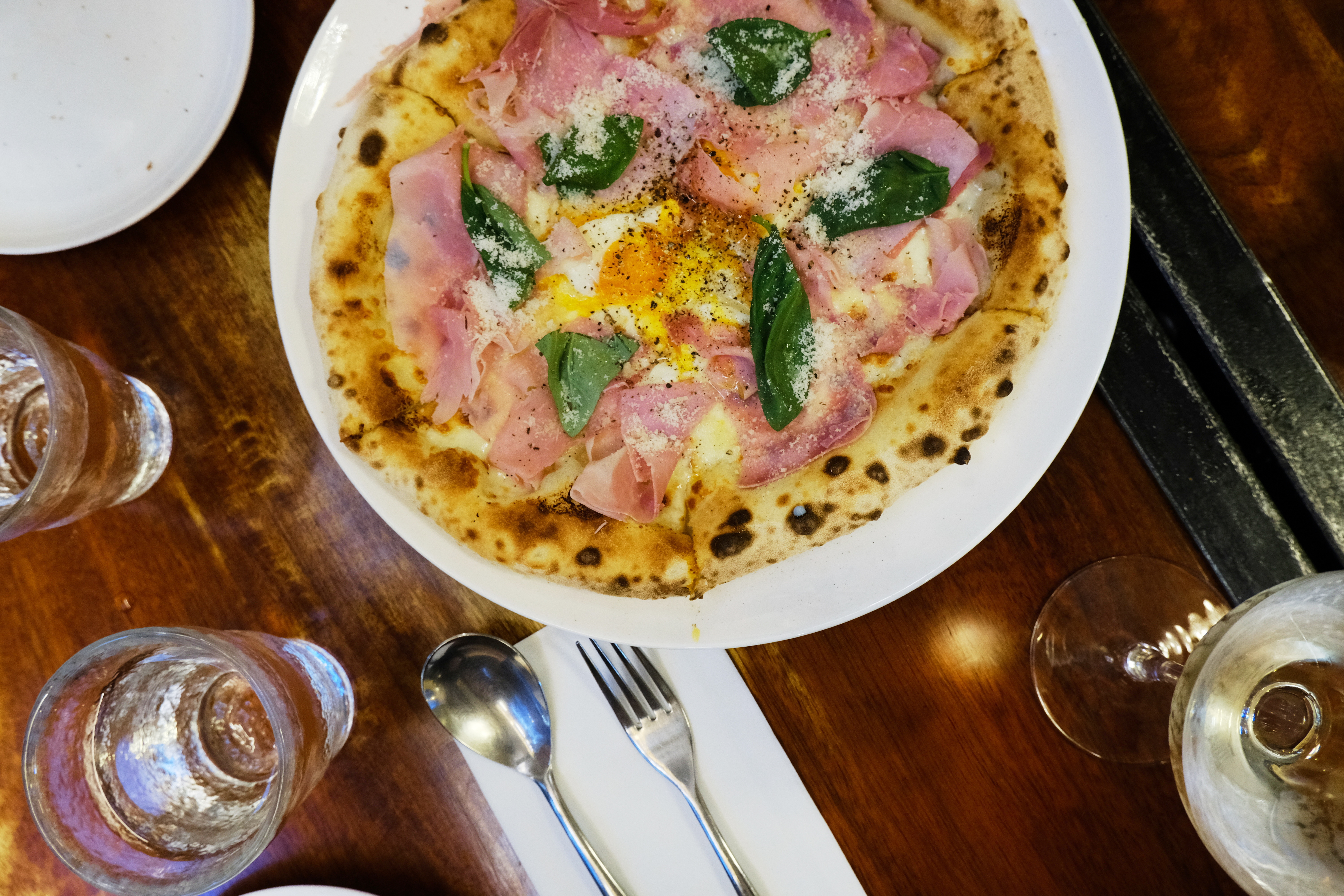 프로슈토, 바질, 프로볼로네치즈, 트러플 오일이 들어간 비스마르크 피자다.