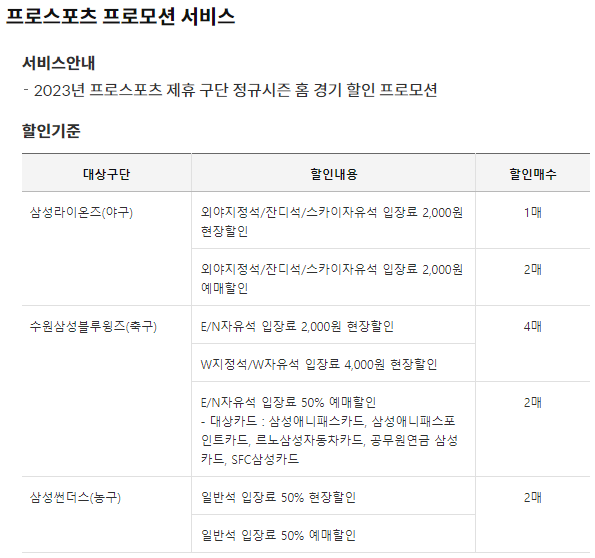 2023년 프로스포츠 삼성 구단 입장료를 할인 받을 수 있습니다.